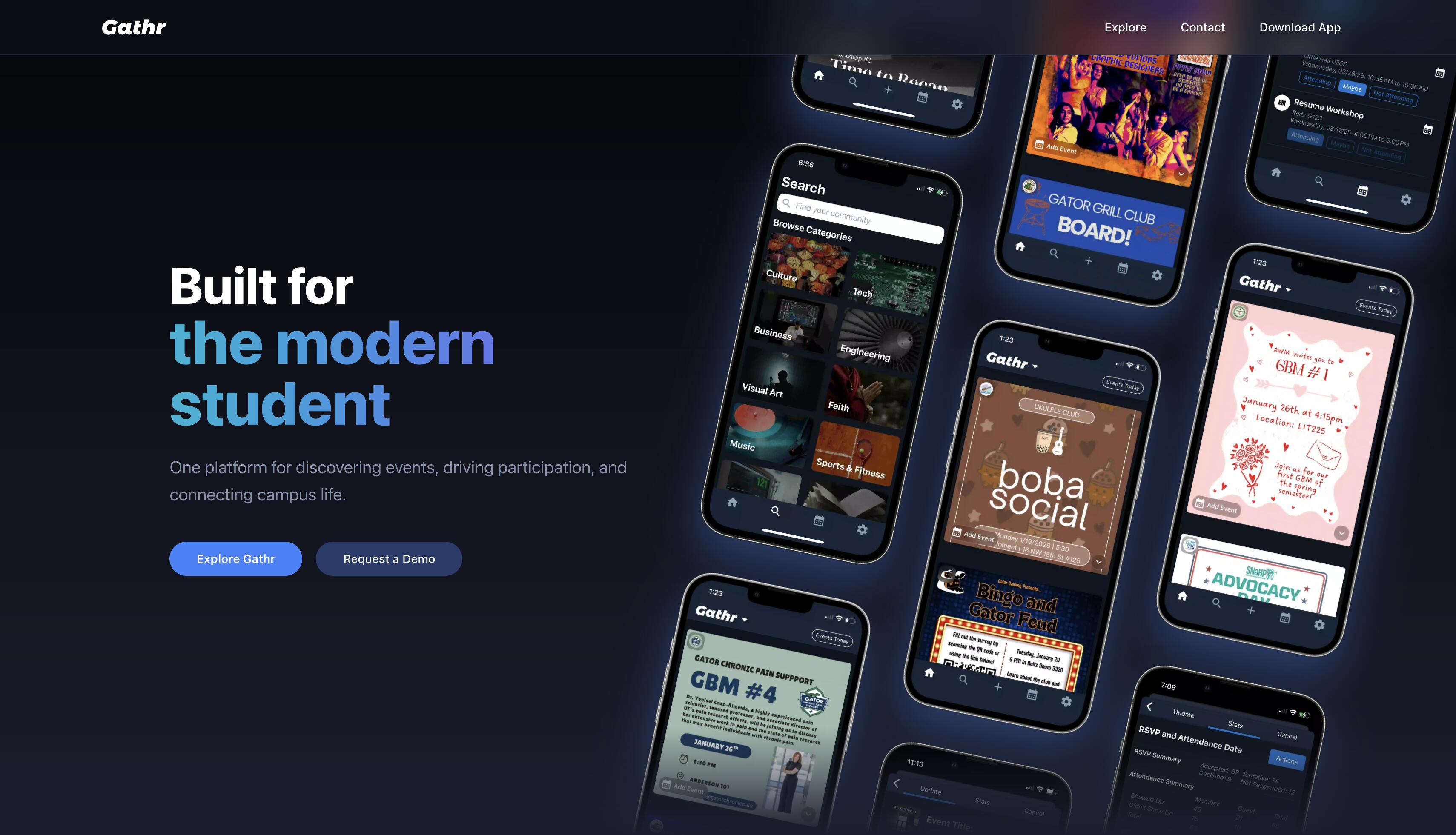 Gathr needed a dependable student engagement system that worked for both students and campus administrators. Existing workflows were fragmented across group chats, social posts, and disconnected tools, making event discovery and attendance tracking inconsistent.